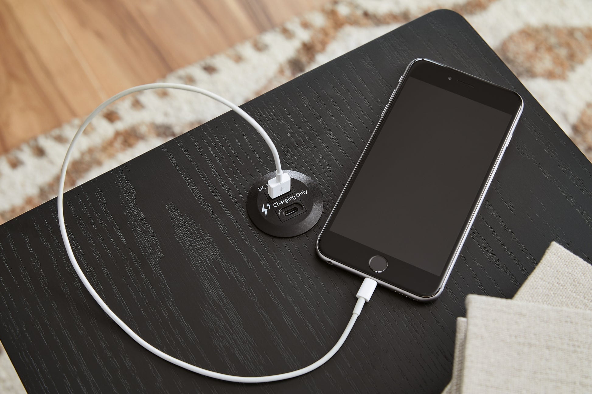 | Detalles | Fabricado con madera maciza, chapas y madera de ingeniería; acabado en madera negra con veta rica; tiradores integrados en los cajones; 3 cajones con frente curvo; carga USB-A y USB-C; cable de alimentación incluido; certificación UL. | |