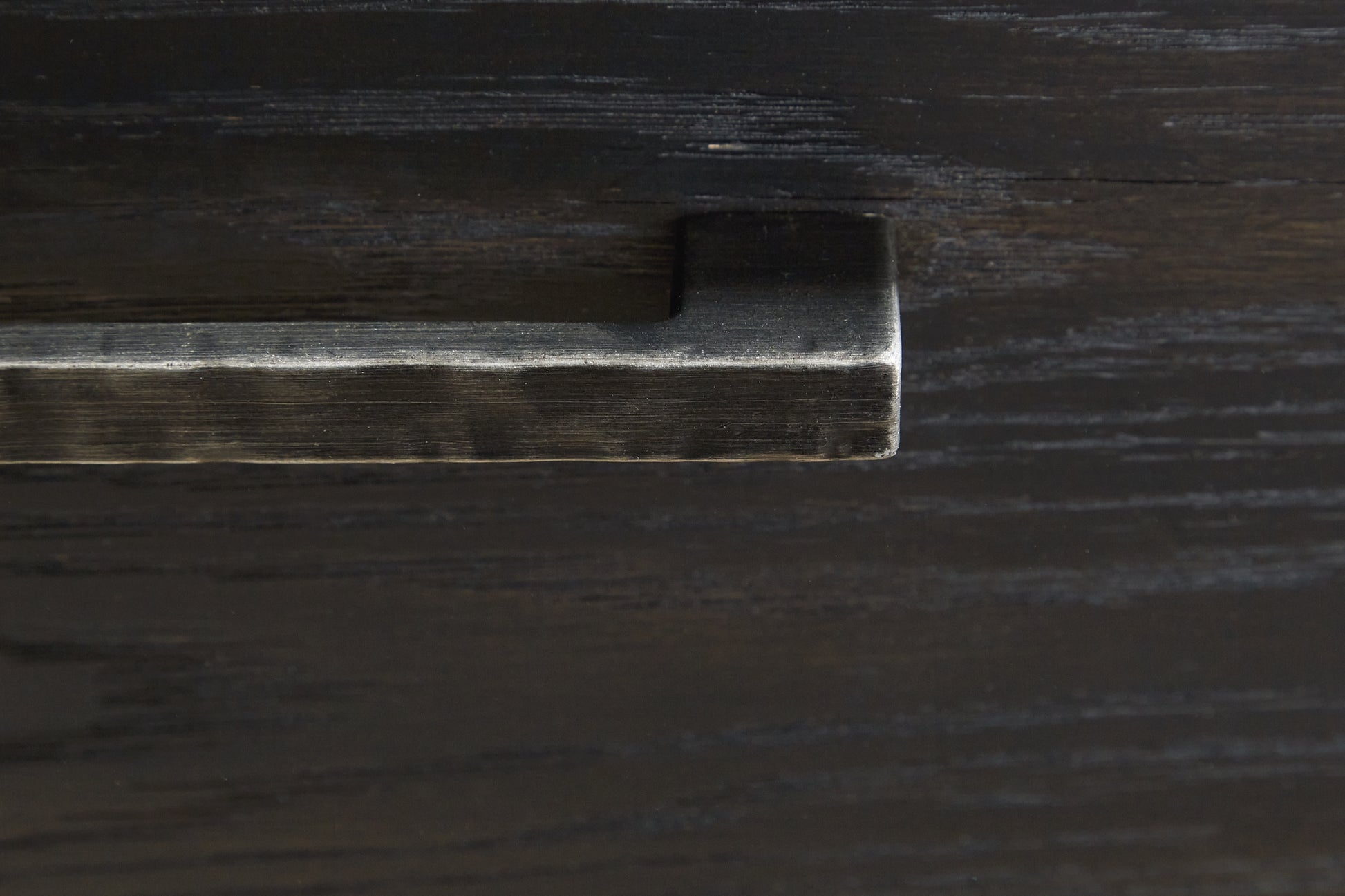 | Detalles | Fabricado con madera maciza y chapa de roble rústico grueso, acabado negro con bordes desgastados, tiradores metálicos con textura rústica en tono peltre oscuro, 2 armarios con puertas de cristal, cada uno con un estante ajustable, 2 cajones, orificios para la gestión de cables, requiere un montaje sencillo: simplemente colocarlo sobre una superficie plana y fijar las patas | |