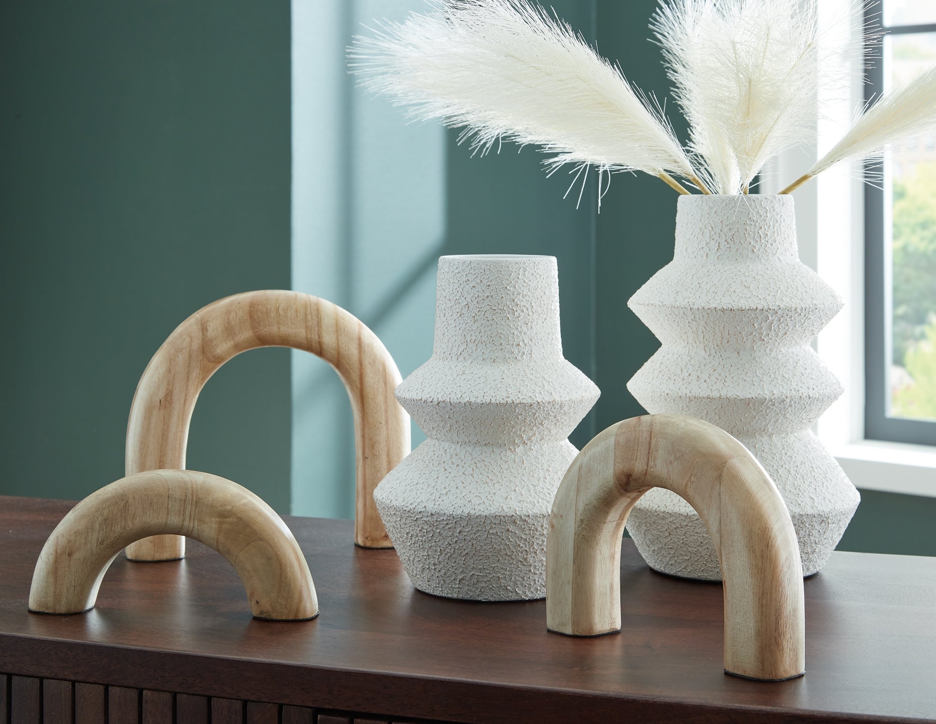 Crea un refugio contemporáneo con los tonos neutros y las formas modernas de este conjunto de accesorios. Sus esculturas, con sus diseños de arcos de líneas fluidas y elegantes, pueden exhibirse juntas o individualmente como piezas decorativas sutiles. El diseño escalonado de los llamativos jarrones añade un toque geométrico adicional.