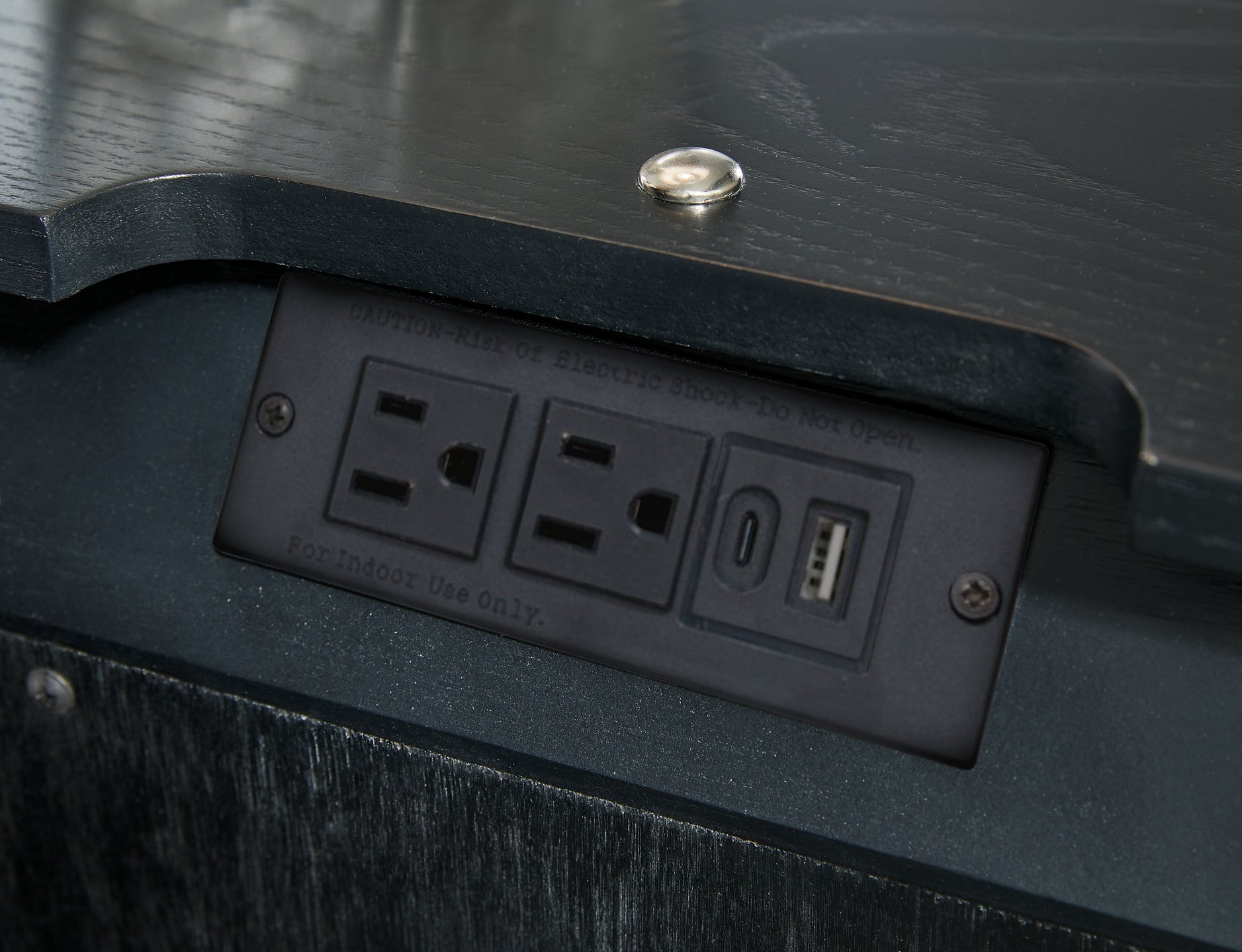 | Detalles | Fabricado con madera maciza y chapa de fresno, acabado negro sobre superficie texturizada con veta de madera, tiradores en tono níquel cepillado, bordes redondeados, cajón de deslizamiento suave con interior totalmente acabado, ensamblaje de cola de milano y guías laterales de rodamientos de bolas de alta resistencia, estante inferior con luz nocturna LED integrada, fuente de alimentación de 110 V con puertos de carga USB-A y USB-C, cable de alimentación incluido; certificado UL. | |
