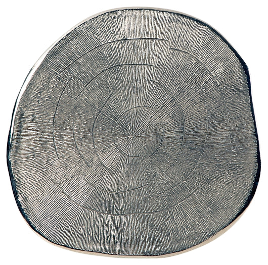 Rich with curated character, this end table puts a contemporary spin on natural beauty. Its irregular grooved top is refined with the glamour of a gleaming chrome-tone finish. A black base completes this cool piece.